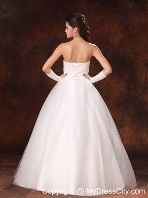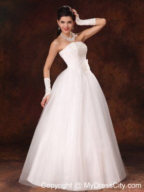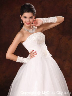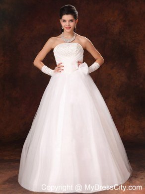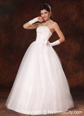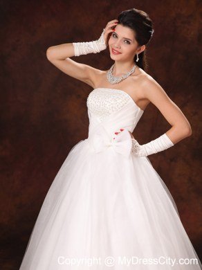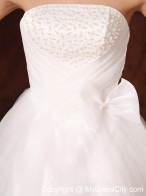 Walk in beauty along the aisle in this jewel-adorned bridal design dress. The strapless bodice made of shimmering beadings features a regular pleated bodice and the dropped waist is highlighted by a lovely bowknot. The flared, floor length skirt made of soft and flowy tulle is worked to produce eye catching impression. A lace-up back completes the look.