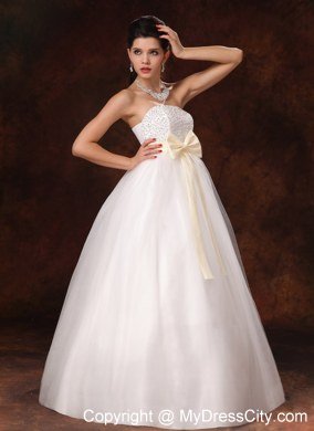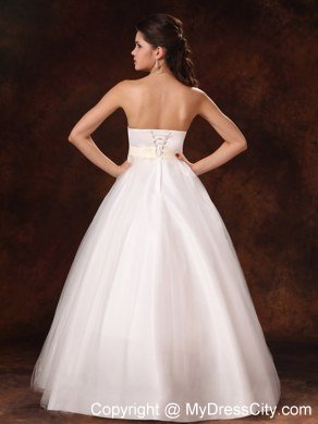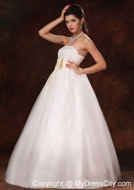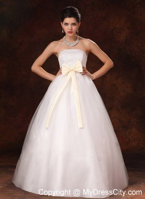 Simply gorgeous. This princess style wedding dress catches your eyes by the first sight. It features a strapless neckline with a nice beaded bodice. A lovely sash with delicate bowknot embellishes the waist and contours your slim curve. The layered puffy skirt flows to the floor contributes to the elegant look. The half open and zipper up back completes this fabulous design. You will never be regret in choosing this dress.