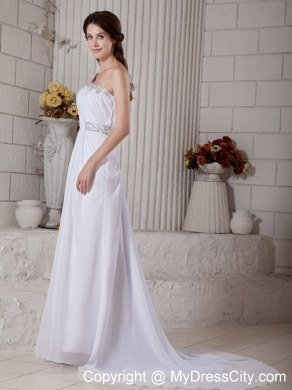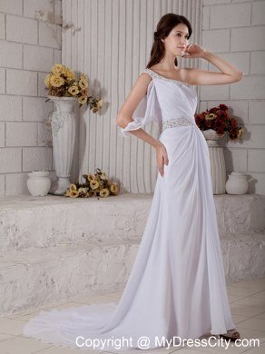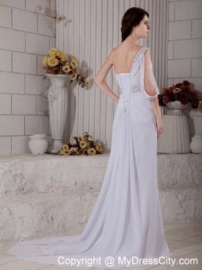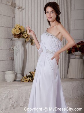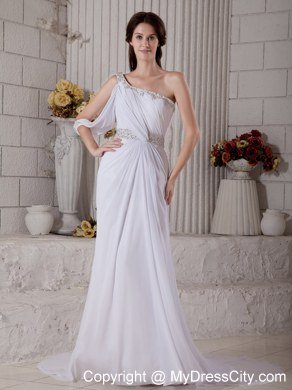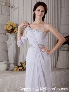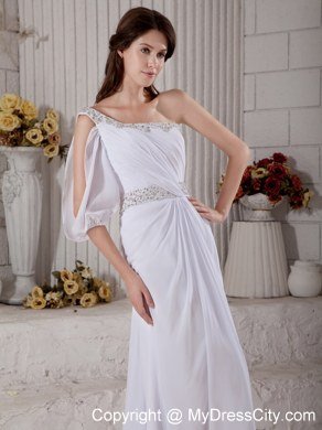 Heads will pathetically moon over you for months on end in this elegant dress. The straightline is wraped by one asymmetrical strap attached a open half sleeve abounded with beading extending around the back. The beaded embellishment with a wrap texture brights up your waist. The floor length skirt attached a court train made of romantic chiffon lets you glide across the dance floor with ease. The back features a corset-style closure that ensures a perfect fit.