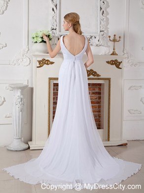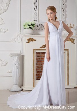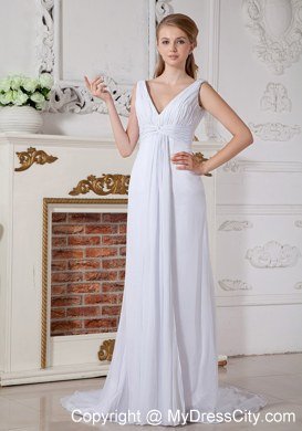 Simple and graceful! This long dress features a deep V-neck with pleating accents on the wide straps which continues to the bodice. The ruched band gathered at the middle of the band extends flowing to the floor, creating a flaring look. The soft chiffon skirt flows naturally in clean lines. The dress has a hidden zipper closure and a long train which add details and interest.
