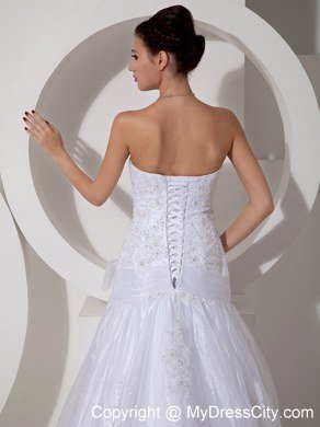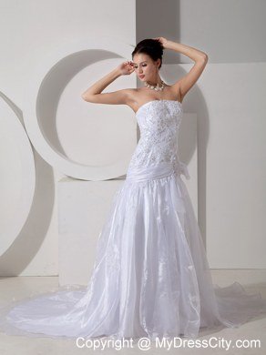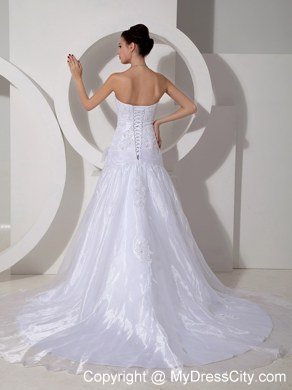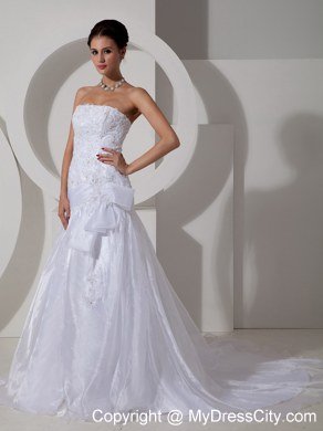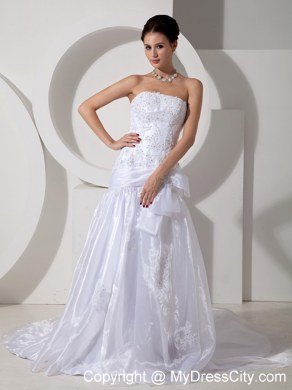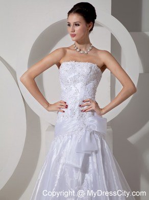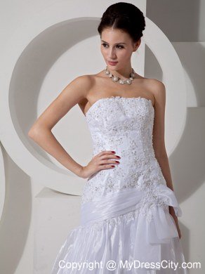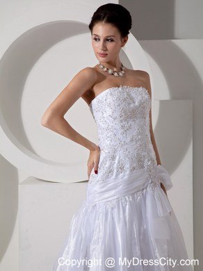 Modern styling meet traditional conceptualization, this unique and dramatic organza wedding gown has it all. Unique appliqued patterns and beads throughout the bodice gives a fresh new take to the time-honored traditional bridal gown. A belt on hips with a bowknot on distinguish tradition from modern. The stylish skirt creates drama and the perfect effect for walking down the aisle. Gown features eye-catching appliques and crystals on skirt and cathedral train. Lace up back completes the gorgeous look.