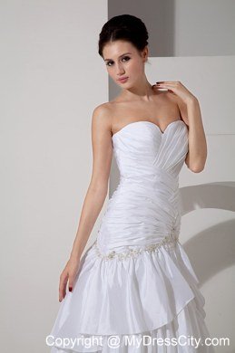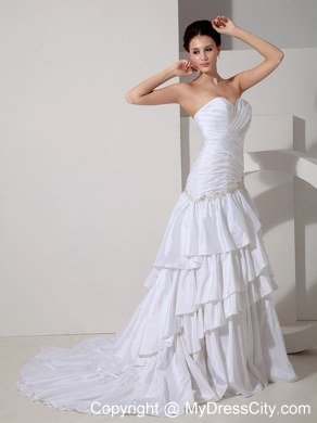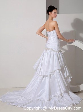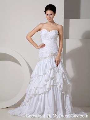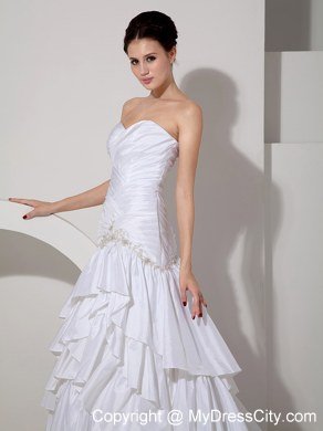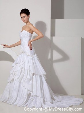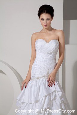 Classic silhouette with contemporary construction, this exquisite wedding Gown is the definition of wow. Taffeta white gown features ruffled skirt tiers and lace-up back. The fitted bodice is adorned with sweetheart neckline and flattering ruches all throughout the body part and the ruches create a cross over look. Beaded appliques are carefully placed for a body slimming effect while corset back ensures a perfect fit. Skirt drama provides a fashion forward look while still maintaining the princess feel you would expect.
