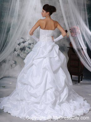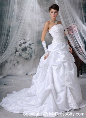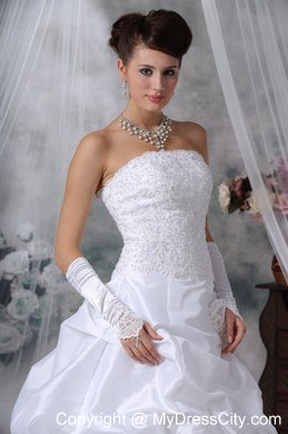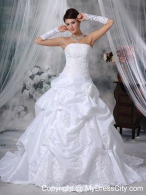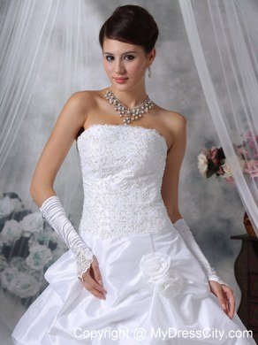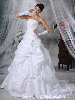 This gown has an elegant and glamorous appeal. A strapless bodice features a lace overlay which is so exquisite and graceful. For the skirt, the pick ups adds delicate to the dress and the hand-made flower on the side gives a touch of romance, while the appliques on the skirt match the top in pattern. Have you ever dreamed to be the fairlady in your big day? This dress will be your best choice.
