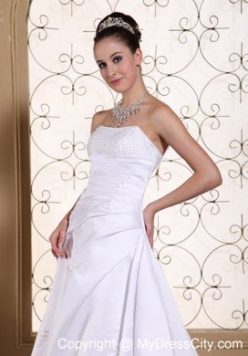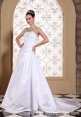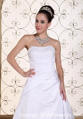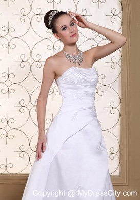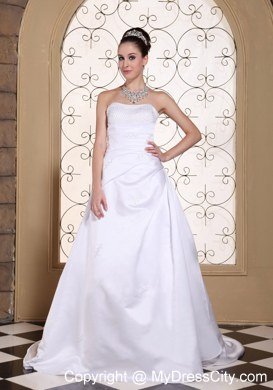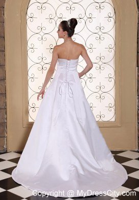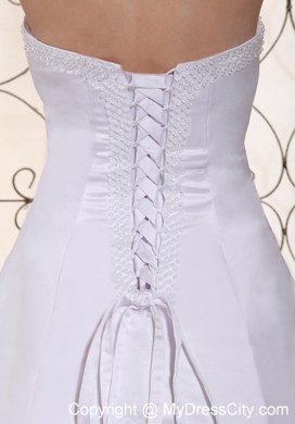 This wonderful wedding dress is accented with shining beaded bust to catch all eyes and the ruched bodice, which show off your perfect figure. The A-line skirt starting from hugging-body attached a court train. The dress is dotted with sequin decoration, which make you sparkling under the spotlight. The lace up style in the back secures the dress in place. You will be sure to impress party in this white wedding dress!