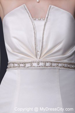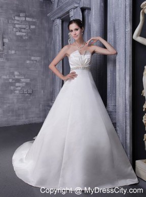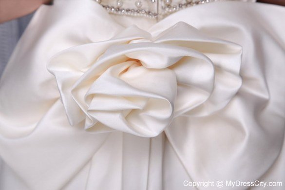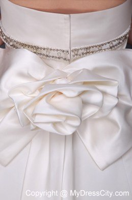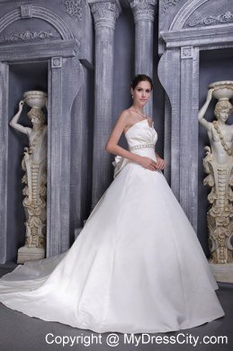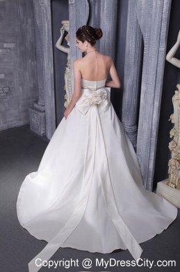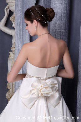 This angelic wedding dress features strapless and A-line silhouette accented with beading in the bust and waist. The bow was embellished in the back with two straps extends into a cathedral-length train in the back.