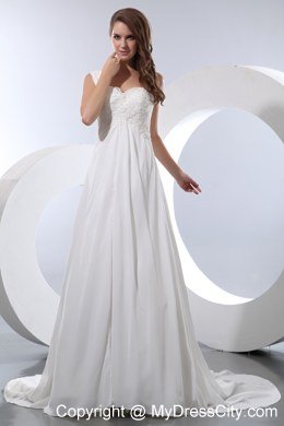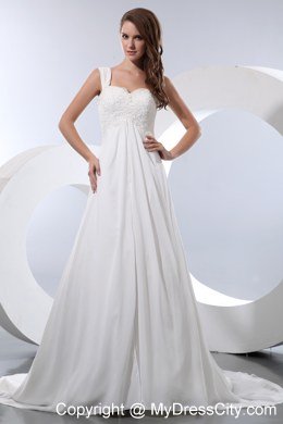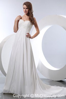 Romatic wedding dress for you! Its impeccably designed sweetheart bodice with appliques and lace is topped off by broad shoulder straps. You'll love its body-skimming fit and the embroidered details. A gauzy sash starts from the midsection of the bodice flows down the skirt and flares elegantly to the floor. A lace up corset style closure in the back secures the dress in place.
