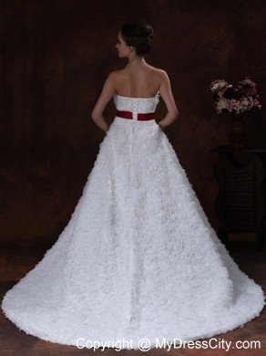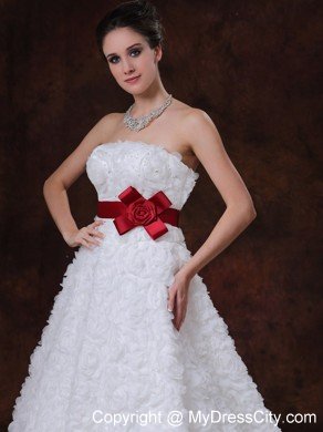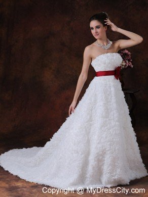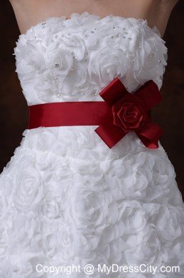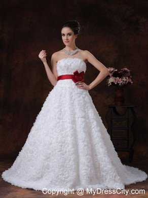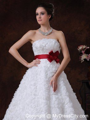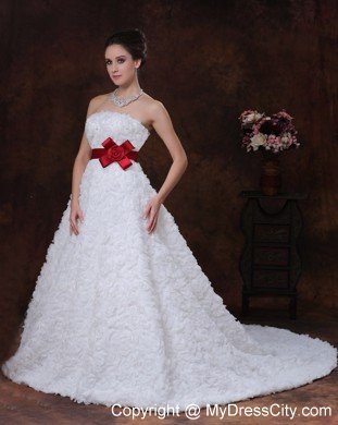 This gorgeous sweetheart white chapel wedding dress is highlighted by the rose pattern adorned all over the skirt, which makes the dress full of fragrance. The ruched bodice adorned by the eye-catching red bowknot in the middle that adds more glitz to the luxurious dress. If you are looking for your dream wedding dress with royal atmosphere, then just picks up this dress.
