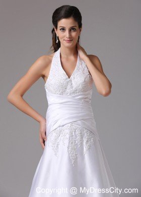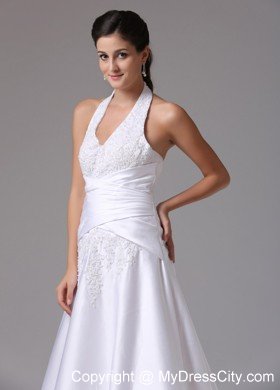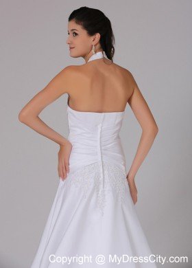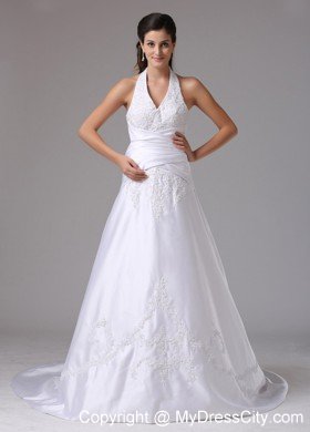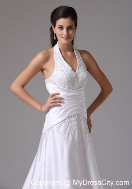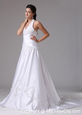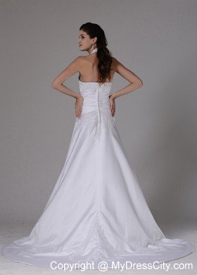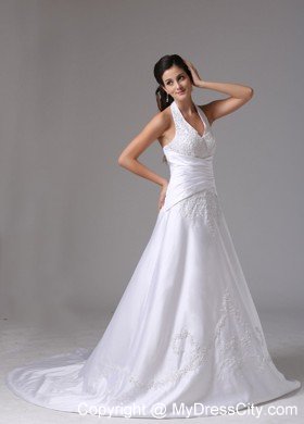 Show off your elegance and dignity! This wonderful wedding dress features a halter top neckline. Together with the formfitting bodice, they are embellished with beautiful embroidery. The embroidery also scatter on the the floor-length skirt area. Ruches decorated the waist area add to the dress more sense of being a fariy princess. The court train appeals you to be a queen! Zipper up back for easy fit completes the look.