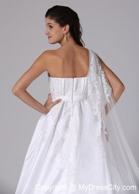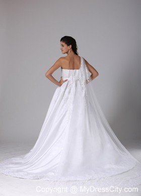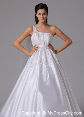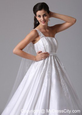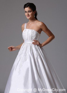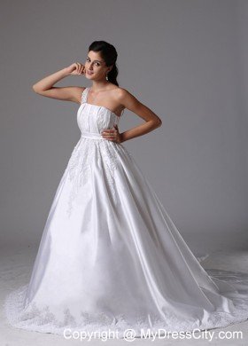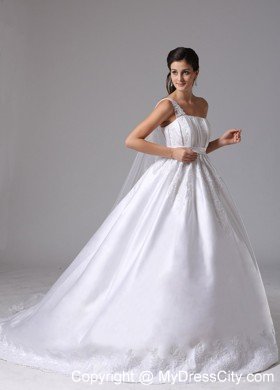If you are looking for a wedding gown that is simple, yet elegant, this one would be a great choice. This dress features the bodice with exquisite embroidery and satin. The see through one shoulder adds the charm. The watteau train completes the look. The back features a zipper up closure that ensures a perfect fit. All eyes are on you!