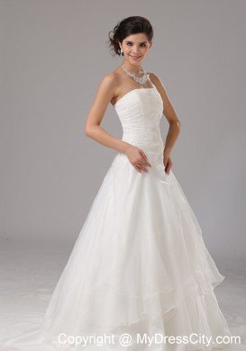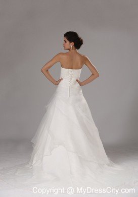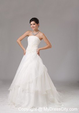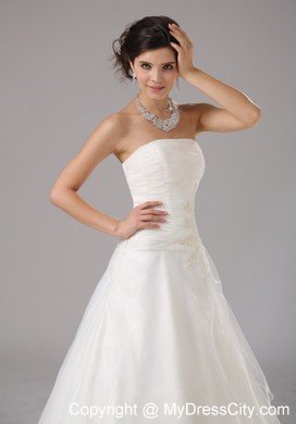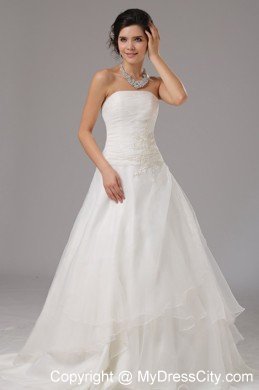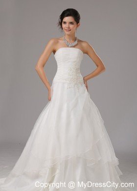 Go for glamour and a fabulous flattering fit with this ball gown wedding dress. A fitted pleated strapless bodice decorated with nice appliques.The elegant A-line skirt starts from the drop waistline with layers of soft fabric highlights the flowy bottom and the romantic train on the back will turn heads. The lace up back finishes the amazing look! An absolutely perfect wedding gown when looking your best is a must.