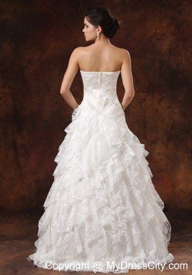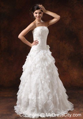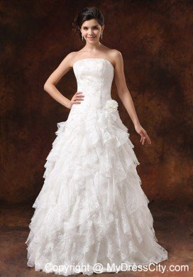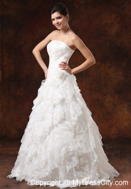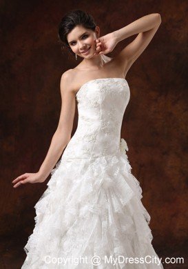 Be the belle of the wedding in this fabulous wedding gown! The strapless bodice features a straight neckline and whole bodice is adorned with nice embroidery and little hand made flowers that greatly adds your feminine figure. The tiered floor length skirt is accented with the exquisite lace ruffles which create a gorgeous look till the hem. A zipper up back completes the stunning design.