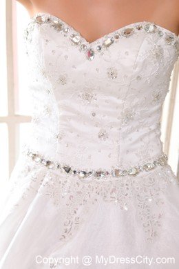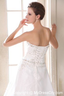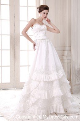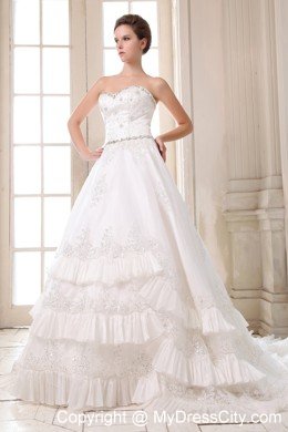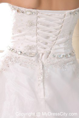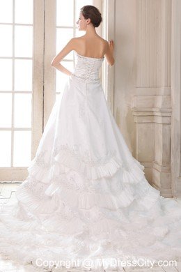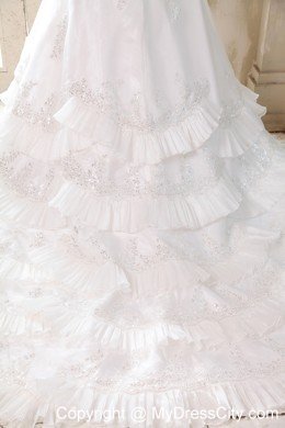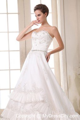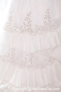 Your wedding day will be a whirlwind of fun and excitement when you're wearing this elegant strapless bridal gown. Rich embroidered accents liven up the sweetheart bodice, and floral appliques crowd.Frilly, lighter-than-air material cascades asymmetrically down the skirt in a series of chic tiers. A lace-up back completes the look.