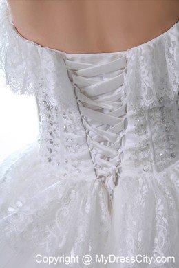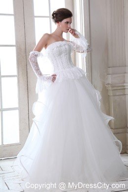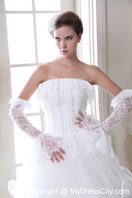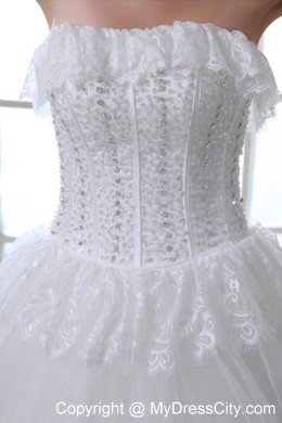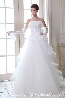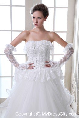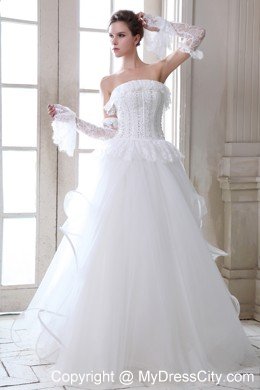 To be the goddess on your big day with this amazing designed bridal gown. The stunning gown features a strapless bodice with falbala hem aroud the bust line and waist that adds your feminie figure better than others. The full skirt gives your a flowy look from the front while the rufffled back makes you a sense of mystery. A lace-up back secures the dress in place.