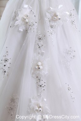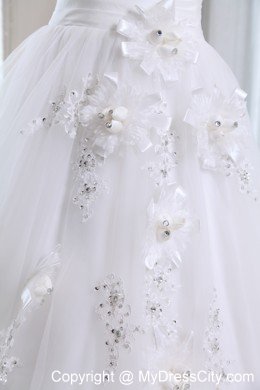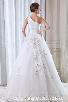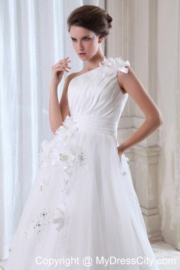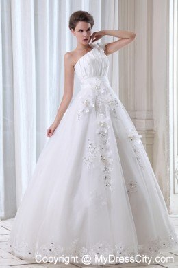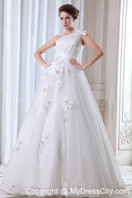Flowing lines give this asymmetric wedding gown a dramatic, windswept look. The single strap adorned with a flower sweeps to the waist band that contours your curve. The full skirt hemed with exquisite lace appliques is highly embellished with sweet flowers that adds your feminie figure better than others. A hidden zipper up back secures the dress in place.