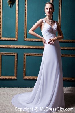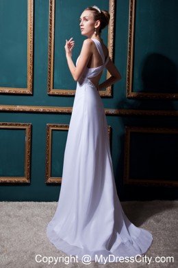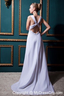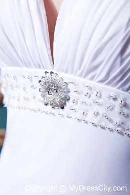 It truly is an example of high end couture fashion. This white gown features a V neckline with X straps that is encrusted with pleated details on the front and back. A coordinating waist sash adds interest and detail to the mid-section of the dress. The beautiful full gown has a lovely train. If you're looking for a high-end dress without the high-end price tag, this is definitely one you should consider.