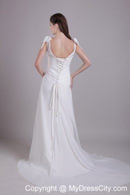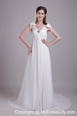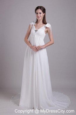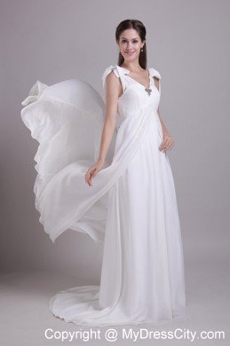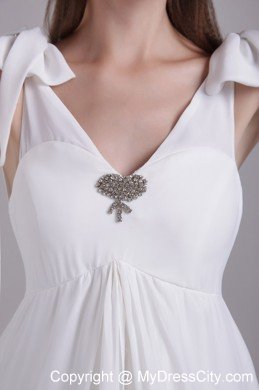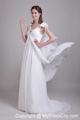 Do you want to be different from others at the party?This beautiful white evening dress with bowknot straps will help you become the shining star.When you put on this enchanting dress to attend parties,others will envy your elegant evening dress.The v-neck design with delicate embellishments shows off your sexy and your slender body.The flowing column skirt with a train around at the very bottom gives you a style of grace.And the chiffon makes you feel soft and comfortable.Everyone will look at you as you enjoy all your party.So,what are you hesitating?Get it home!