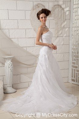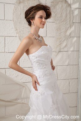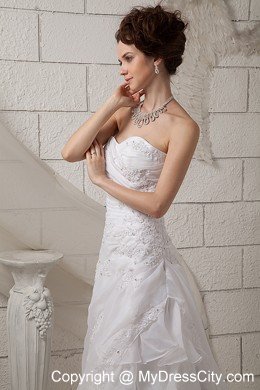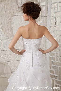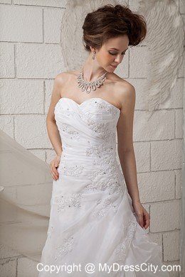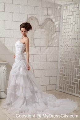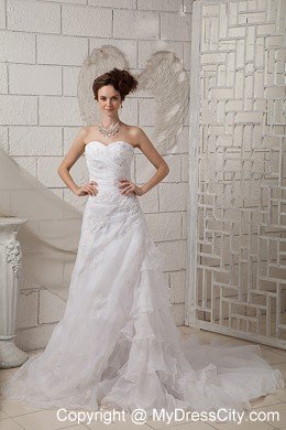 This white wedding dress has a beautiful sweetheart neckline. And it is featured with the ruffles layed by layed at the bottom , which shows the figure perfectly and the long trail makes the dress look even more beautiful that it should be.The bodice is decorated with pretty appliques, which is eye-catching!