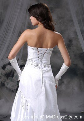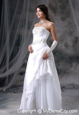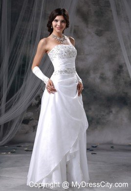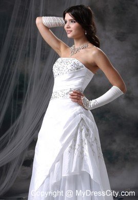 Do you want to be the most beautiful bride? If so, this wedding dress can definitely be one of your dress list. This dress features a strapless bodice which is wraped by a wide asymmetrical ruched band. The sparkling sequin fabric adds to the glamerous look. The gorgeous layers ruffles on the left of the floor-length skirt gives you a touch of romance for the dress. The lace up back finishes the pretty design.