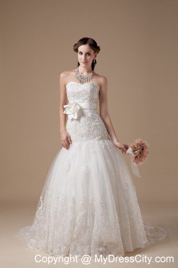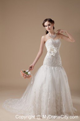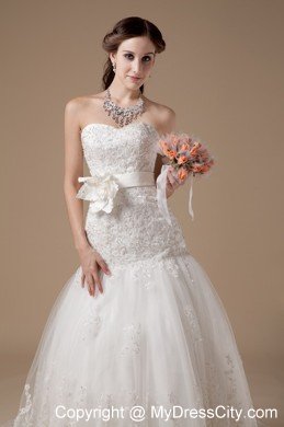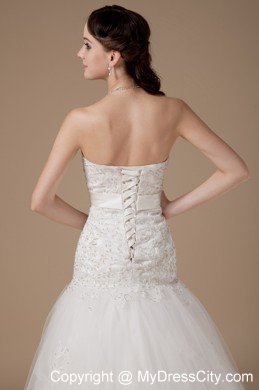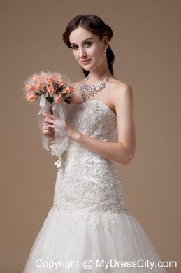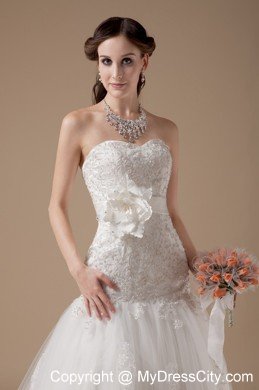 You will be a most beautiful bride when you are in this wedding dress. It features an elegant strapless sweetheart neckline bodice and a mermaid style skirt. The fitted bodice is fully covered with intricate embroidery and has a banded waist with a beautiful handflower on the left which is adds detail and interest to the dress. The multi-layered tulle with delicate lace pattern makes it enchanting. The lace up tie back finishes the gorgeous look.