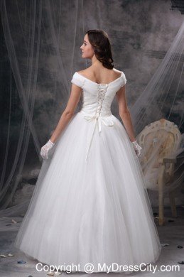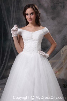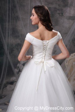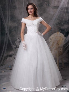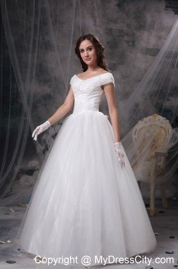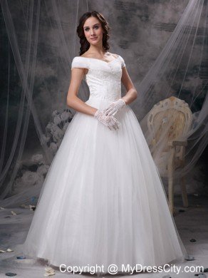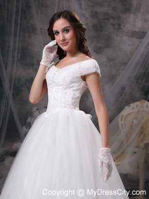Look gorgeous in this wedding gown. This traditional dress has cap sleeves and a wide V-neckline. The gown is fitted through the bodice and is flared through the lower portion of the skirt. Ruched and beaded on the top with appliques on the bodice makes the dress a feeling of grace! Tulle overlay covers the entire gown for a delicate look that ? romantic for your special day. The skirt has a lace up back.