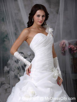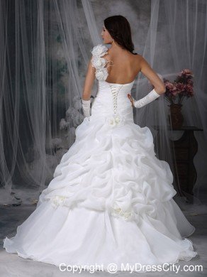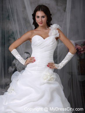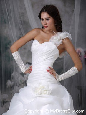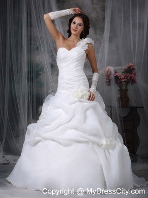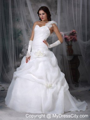 Are you looking for a dreaming wedding dress? Here it is. It features a sweetheart neckline, a ruched bodice and a one-shoulder strap adorned with floral accents. Flower-shaped ruffles and floral accents on the romantic skirt make the beauty of the dress vivid. The train is perfect with the ball gown since the substantial structure of the skirt can balance the weight of a train.