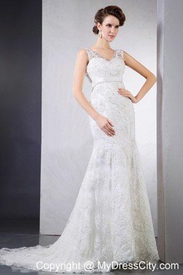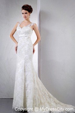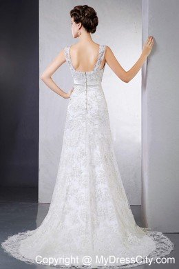 Romantic style dresses have a certain charm that never goes out of style�regardless of age or occasion. This one is an example of what we mean. The whole wedding dress is made of lace and features two wide straps bodice and sweetheart neckline. The skirt falls in clean lines to the floor before extending into a gorgeous train in the back. A zipper up closure secures the dress in the back and is the perfect finishing touch.