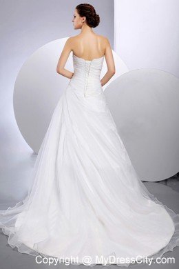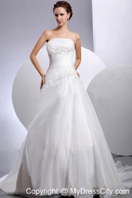 Gorgeous and simple! Strapless dresses are one of the sexier styles on the market today. The fitted, strapless bodice made of an all-over ruches and appliques accenting the straight neckline. Fabulous skirt is highlighted with the layers and the chapel train. A lace up corset style closure in the back secures the dress in place.