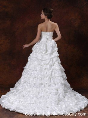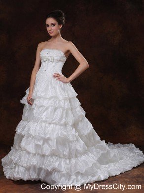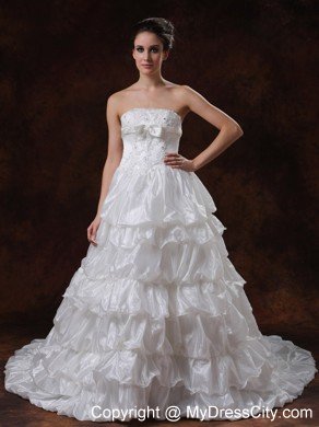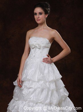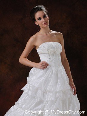 You're sure to get swept away by the sheer elegance of this strapless gown in your holy wedding! Its gorgeous bodice is topped off by a strapless neckline that's edged with embroidery. The ruching bodice is accented with exquisite appliques that flares the skirt wonderfully. Layer upon layer of dramatic, gauzy material makes up the tiered skirt. That is ruffles create a cascade effect through the floor-length hem. A gorgeous lace up completes the back.