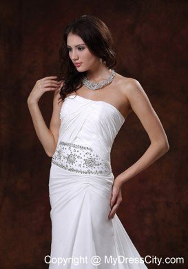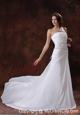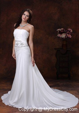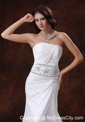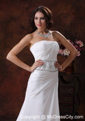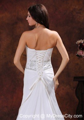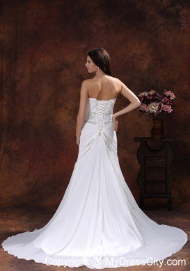Strapless dresses are one of the sexier styles on the market today. This one features a strapless bodice with wrapped details and beading in the waist area and catches the light in a lovely way. The bottom of the skirt has lovely pleated details and a big train. The dress sways beautifully across the floor when you move, as if you're floating on air. You are sure to be charming and fabulous at your very special day.