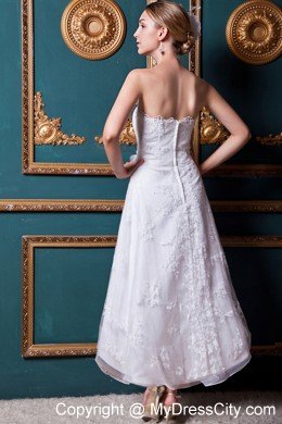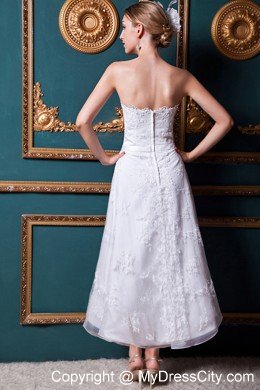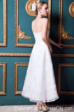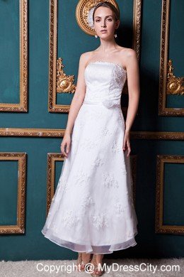 Are you longing to own a perfect dress for your wedding? This may be just the one you can't miss. This dress features a strapless straight cut neckline, the bodice encrusted by nice appliques decoration, which is so delicate and pretty. The slender sash band with a hand made flower aside makes the dress more elegant. For the skirt, there is a see-through tulle overlayed, which is so soft and gentle, while exquisite appliques adorned on the ankle length skirt make this dress unique shaped. This dress will be sure to wow all the presents in the wedding.