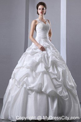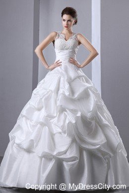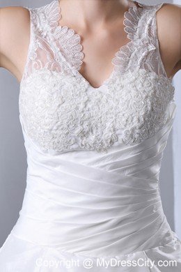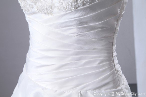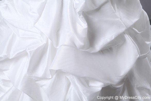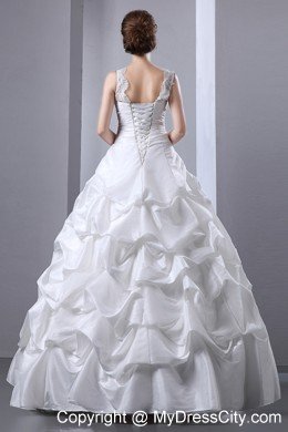 This white gorgeous gown is your perfect choice to attend your party, formal or any other occasion. The most impressed part is the upper bodice, it features two wide straps with tasteful appliques and crossed ruchings. While the floor length skirt is full of fabulous pick-ups that create a beautiful shape when you move. The unique straps can show the beauty of your back and an adjustable lace up completes this wonderful design.