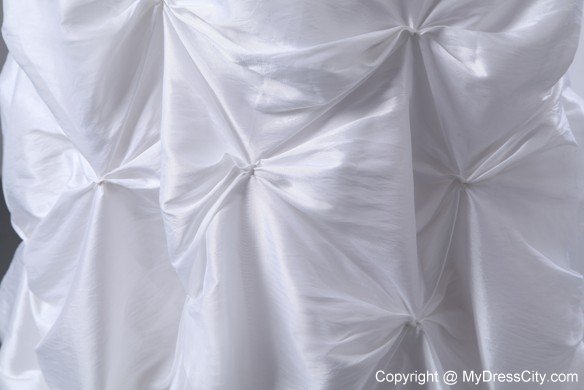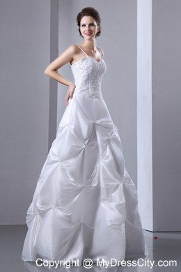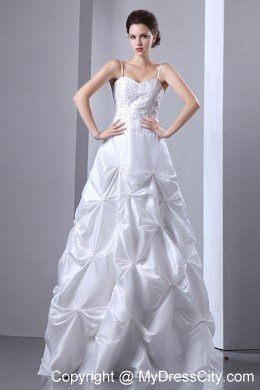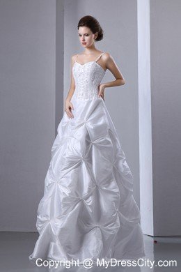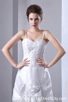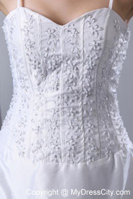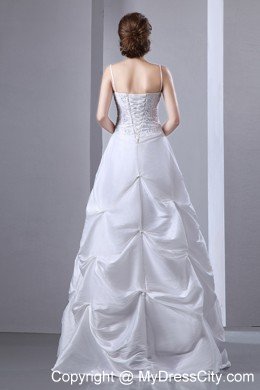 Simple while stunning! This white gown with two spaghetti straps is characterized by embellished beadwork and exquisite appliques that can show your natural waistline. The floor length skirt is full of glamorous pick-ups to create a pretty bruch train, and a lace up closure completes this unique design. Please don't miss this rare chance to show your beauty!
