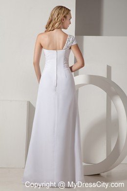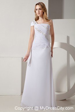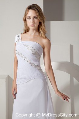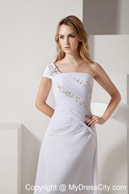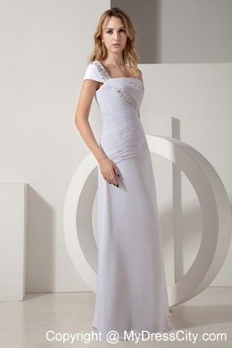It truly is an example of high end couture fashion. This gown features a straight neckline with one shoulder strap that is encrusted with ruched details and beading on the front. The beautiful gown features zipper up back. The floor length skirt create a beautiful shape to complete the dress. If you're looking for a high-end dress without the high-end price tag, this is definitely one you should consider.