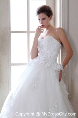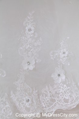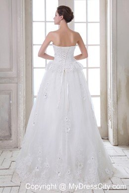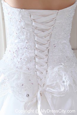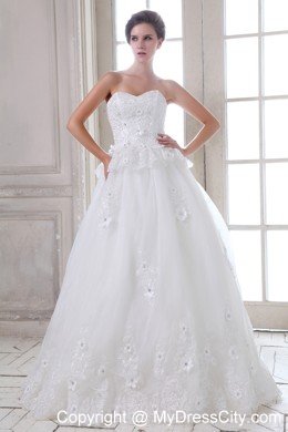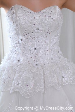 Walk in beauty along the aisle in this flower-adorned bridal design. The strapless bodice features a sweet heart neckline and is adorned with lace flower throughout the whole bodice extended to the waist to creat a lovely falbala hem that greatly adds your feminine figure so much. The full skirt is accented with the same lace flower embellishments as well as the hem. A lace-up back completes the look.