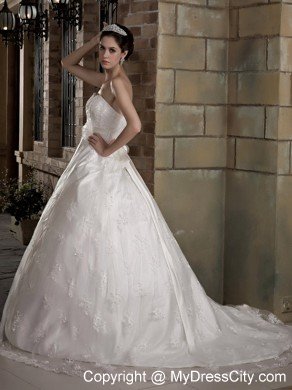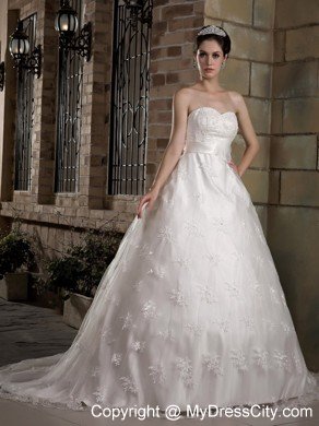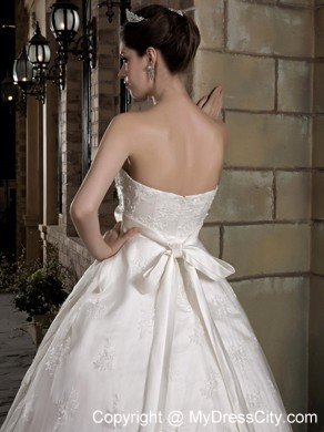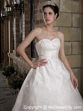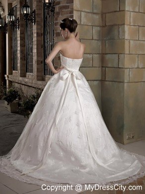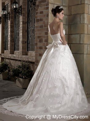 How gorgeous the wedding dress is! This dress features a strapless sweetheart neckline design encrusted by the lace fabric, which is so delicate and pretty. The simple wide sash with a long bowknot ribbon on the back make the dress more elegant. For the skirt, there is a layer of see through lace fabric overlay, which is so soft and gentle, while the exquisite floral embelishments and the cute train completes this wonderful dress. This dress will be sure to wow all the presents in the wedding.