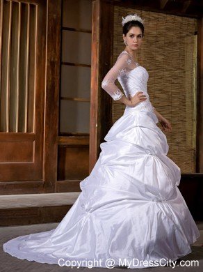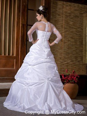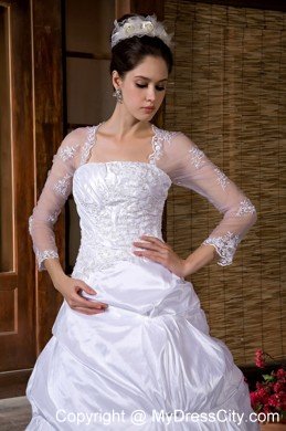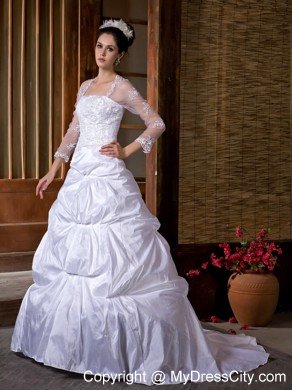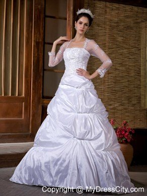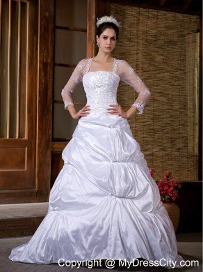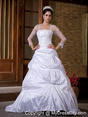 This one will put you to mind of a traditional southern belle, when you put on this white wedding dress! It is highlighted with a straight neckline and long sleeves wraping the shoulder and back with exquisite appliques. The A-line skirt with many layers of pleating has a brush train that cascades to the floor. A zipper up style closure in the back secures the dress in place.