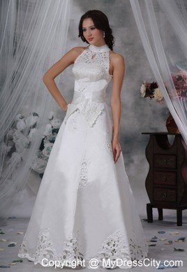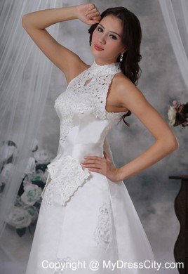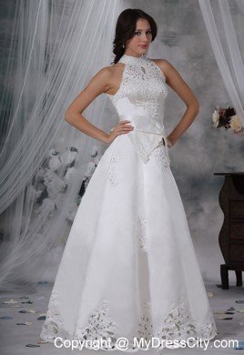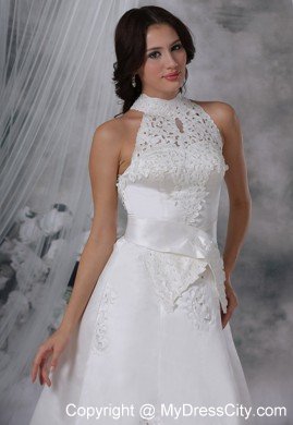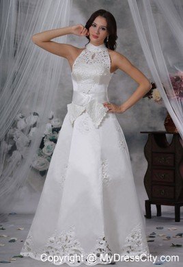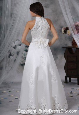 This wonderful wedding dress is accented with a halter top specialized by lace fabric to cover the chest and the A-line skirt starting from hugging-body waist with beautiful lace trim, which adds your elegance and upgrades your taste. The bows in the front and back adds another dimension beauty to this already lovely gown. A hidden zipper makes for easy off and on and secures the dress in place.