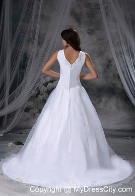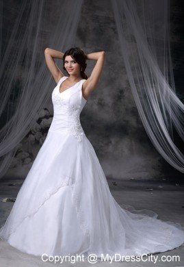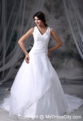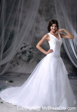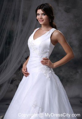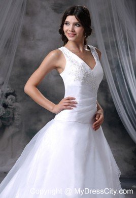 You will be a real surprise in this elegant wedding dress for your husband and other people! The torso features a V-neck neckline and exquisite lace embellished with refined appliques. To catch your eye, the ruched waistband has a lovely decoration in the mid-section. The floor-length A-line skirt is covered with a sheer tulle, which makes you float in the sky. The zipper up back finishes the overall look.