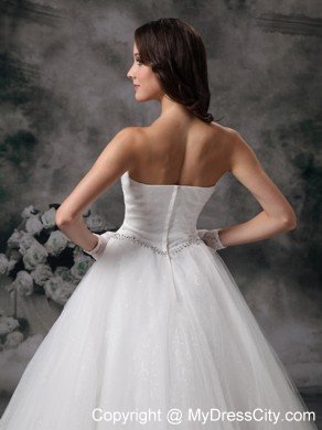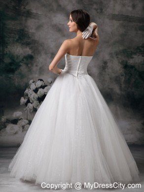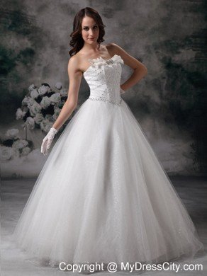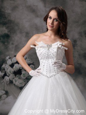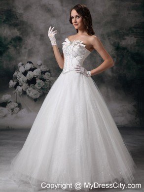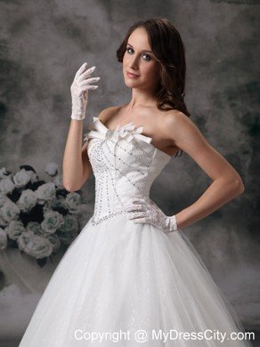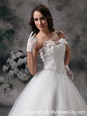 You'll be the classic bride you've always dreamed of being in this Bridals wedding gown. This strapless dress has a straight neckline with a special flower on the middle and rows of neat pearls. Dazzling beading accents the band at the waist. The skirt has a distinct A-line shape and a layer of tulle adds dimension. This is the traditional gown with modern updates.