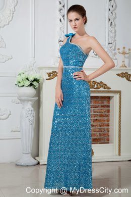 If you are looking to put a bit of sparkle and bling into your next formal event, this stunning gown would definitely be a great way to do it. It is made in a traditional sheath style and has been completely embellished by blue and shimmering sequins throghout, which creates a fantastic effect when worn. It has a one shoulder strap design and a thin silver sash across the midsection. The dress sways beautifully across the floor when you move, as if you're floating on air. A truly stunning dress for any event on your calendar.