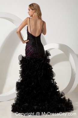 Feel special on your special day in this perfect dress. This funky black and purple dress is featured by a strap bodice and a sweetheart neckline. The ruched bodice hugs your curves past your hips shows your slim figure and radial beads covers whole bodice adds more fun and flirt to the dress. The high-low skirt with the intricate ruffles at the bottom with a small train give a amazing beauty of art. The zipper up open back finishes the look.