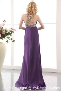 Stunning is the word that comes to mind when you look at this dress. It has a beautiful halter-style bodice with a V neckline and heavily beaded strap and bust hem. A beaded applique adorns the midsection just below the pleated bust. The strap crisscross in the back of the dress which is exposed and open. A high slit in fron with a beautiful train in the back. Fantastic!
