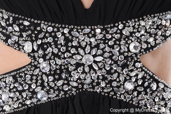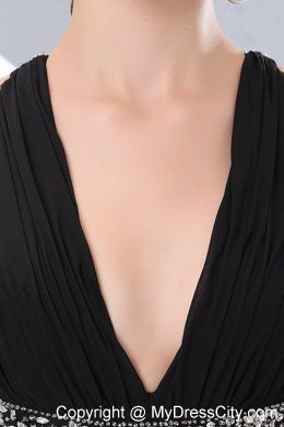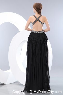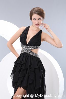 If you're looking for a great dancing dress, look no further. This one will have you saying cha cha cha in no time. The deep V- neck with two straps crossed in the open back and an asymmetrical X shap with beading drenched to shine your sexy, slim figure. The underskirt is mini-style with many tiers while the top skirt is wispy, ruffled and has an asymmetrical hem, making it longer in the back.