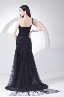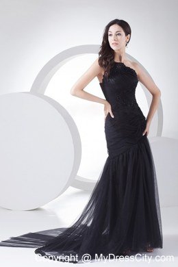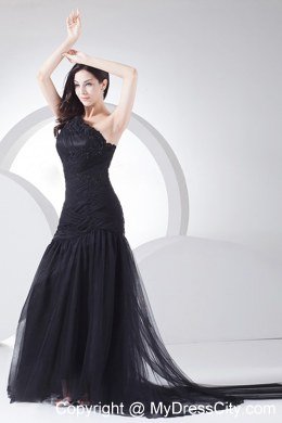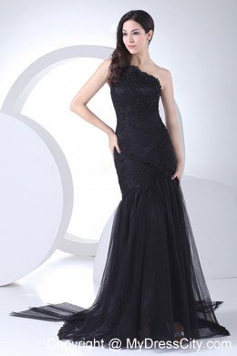 Terrific! That is the only word to describe this design. It features a irregular one shoulder neckline with exquisite ruching encrusted. The bodice is full of crisscrossed ruching and beading which continues to the hip as well as the back. Soft tulle skirt flows in clear line to the floor and fllows a gorgeous brush train.