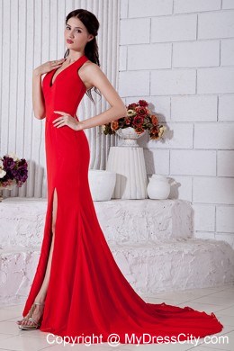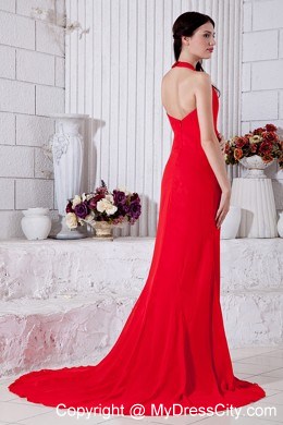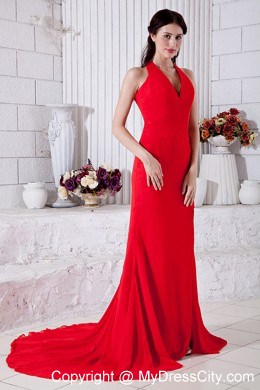 Elegance is what this red prom dress portrays! Halter top and deep V-neckline make a way for a sexy half-open back and a court train for accent. The empire skirt flows beautifully with a loose fit that will make it easy to move the night away. Hidden zipper up back completes the fabulous look. This dress will be sure to become a show stopper!