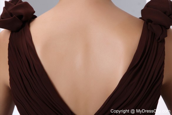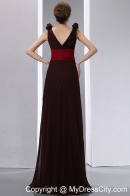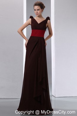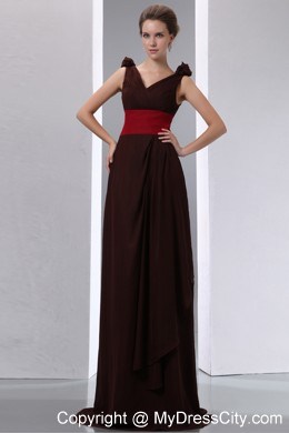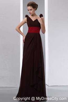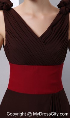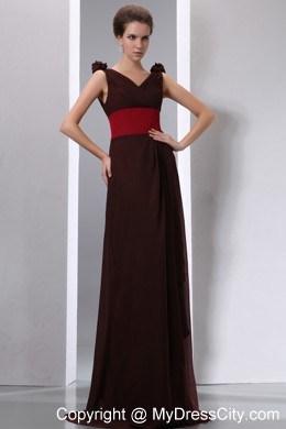 Sleek lines and stunning texture elevate this gown to a whole new level of style! You'll adore its sharp, eye-catching V-neckline and Ruched bands are woven across the front of the fitted bodice.The floor-length skirt is a long and winding series of ruffles that begins at the waist and envelopes the legs in luxurious material all the way to the floor in a pretty A-line shape. The floral embellishments on the shoulder and a contrasting red sash on the empire waist add the drama to the classic style.