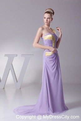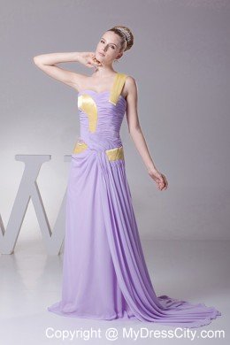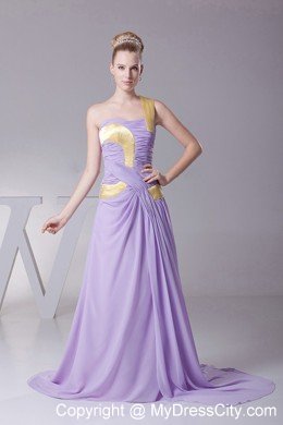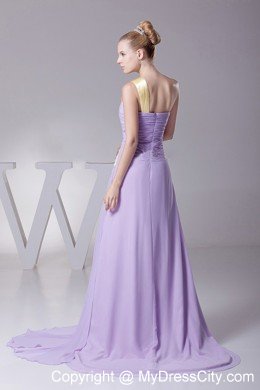 Let your hair down in this elegant purple prom dress featuring a ruched bust with the lovely contrasting colored one shoulder neckline. The ruched bodice accentuates a slim waist. The dress is highlighted by light yellow colored ribbons on the bodice which decorates the whole dress perfectly. The final touch on this elegant dress is the draping down floor length skirt with a sweep train and a zipper up back.