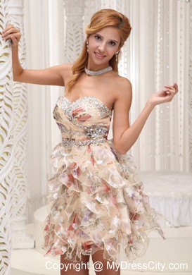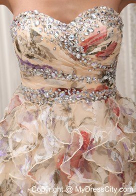 Wow your date in this brilliant ruffle skirt! The strapless sweetheart bodice is fitted with clear beading shimmering embellishments. Short skirt features seaweed ruffles and makes the dress much more cute and lovely as if you are a spirit in a fairy tale and skirt encrusted by funky flower prints accent which are all the rage for prom and homecoming. A zipper up closure in the back secures the dress and completes this design. You will be stunning in the dancing floor.
