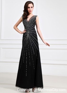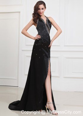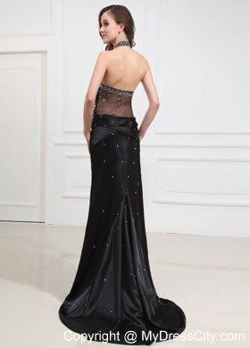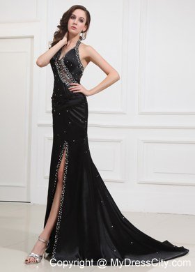 Extremely sexy is what this black dress portrays! This flirty dress accents a halter top and deep V-neckline which make a way for a sexy half-open back and a lot of sparkling beading for accent. The floor length slit skirt flows alluringly with a loose fit that will make it easy to dance the night away. A stunning dress for those occasions when you really want to 'wow' the crowd.