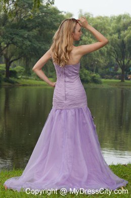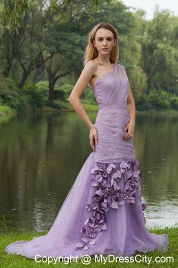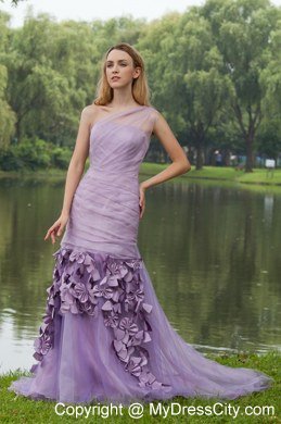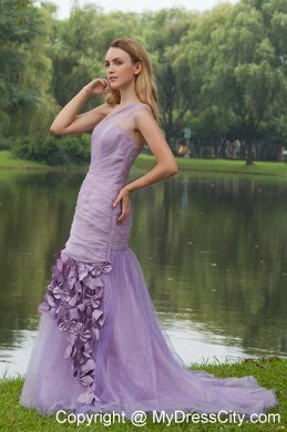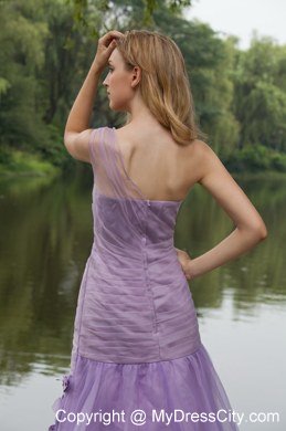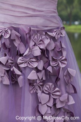 The bodice is accented with the one shoulder which made of tulle.The bodice features the ruching while the unique design on the bust area contours your curve.The scattered bows feature the skirt.This purple prom dress has a sweep train.A simple zipper up back completes the look.